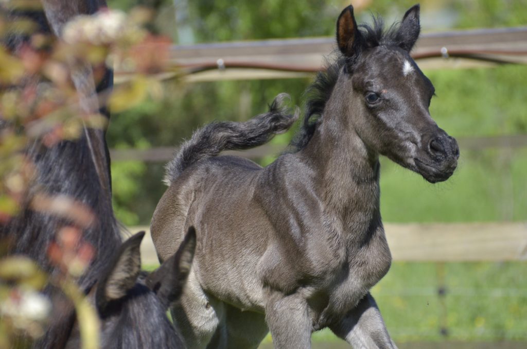 Cette nuit-là, ce petit brigand avait prévu son coup, et on a tous a été surpris par son intrusion au sein du boxe de Magic. D’autant plus que d’une manière inexplicable la caméra poulinage a coupé la scène à ce moment là. Il s’appellera donc 𝑶𝑹𝑳𝑨𝑳𝑶𝑰, mâle Pur-Sang Arabe, noir homozygote, avec des papiers… recherchés (père de mère : Magic Magnifique).